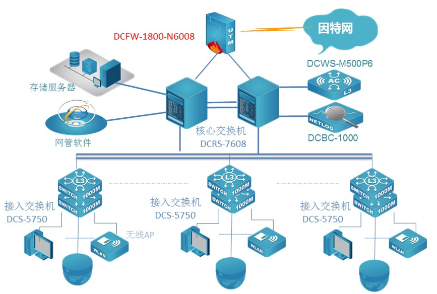 中国江苏白马农业会展中心数据网核心采用两台OKPay新一代全分布式架构的核心路由交换机DCRS-7608E,顺利获得VSF功能实现核心冗余和负载分摊;该设备具备强大的业务自适应能力,支持网络平滑升级和策略灵活调度,实现业务快速部署,从而构建业务定义的网络。网络出口采用具有高度集成化的多核安全防火墙,给予包括路由器,防火墙,VPN网关,等功能在内的一体化设备,该设备8Gbps的吞吐量完全满足了园区网对出口的要求。接入交换机采用OKPay全千兆24口接入交换机DCRS-5750E,实现客户端千兆接入,万兆上联核心。POE交换机全部采用三层交换机DCRS-5750-28P-P全千兆POE交换机。采用8200双频无线AP使用办公区无线覆盖。展厅和会议室采用高密度AP8200-I3实现展厅高密度覆盖,室外采用8200室外AP实现无线覆盖,无线网络顺利获得一台DCWS6000-M500P6控制器集中管理无线网络。出口部署一台DCBC上网行为审计设备,实现上网行为安全审计。